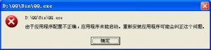 qq运行错误“由于应用程序配置不正确,应用程序未能启动。重新安装应用程序可能会纠正这个问题” 解决方法:是因为您的计算机中缺少VC运行库导致的,建议您到互联网上下载相应的VC2005运行库安装到您的计算机中即可。如果您安装了VC2005运行库还是不行,建议您安装:(http://download.microsoft.com/download/6/B/B/6BB661D6-A8AE-4819-B79F-236472F6070C/vcredist_x86.exe)。