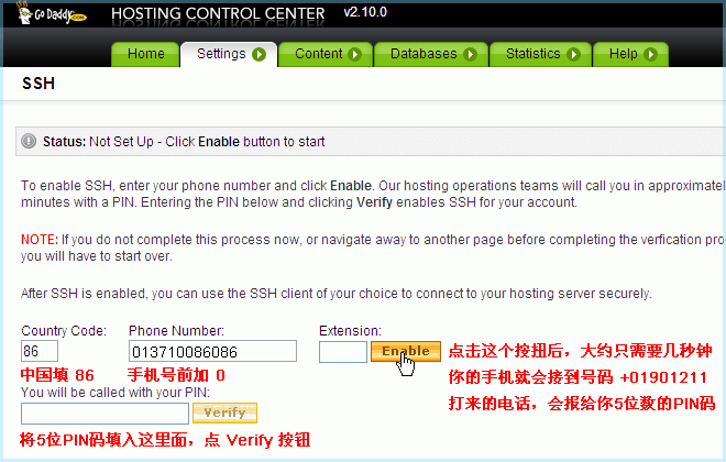2、在开通设置页面里,填写你所在的国家区号和你的手机号码,点击 Enable 按钮后,稍等几秒钟,你的手机就会接到号码为 +01901211 的来电,你不用担心自己英语不好,因为打来来电话的是电脑机器人,它会报给你5位PIN数字,会重复一遍,仔细听好记好就OK了。报完后电话会自动挂断, 你将听到的5位PIN填入按 Verify 按钮确认。如下图示: