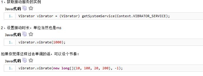 android.os.Vibrate代表着手机的振动器。用法很简单,通过getSystemService()方法获取示例,然后调用vibrate方法便可以实现震动。
