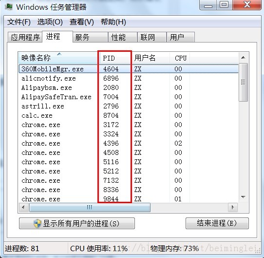 PS:如何查看PID的方法,在上面窗口中点击查看->选择列->勾选PID就好了,嘻嘻。